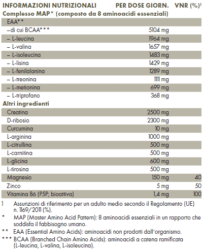 - Complesso MAP: contiene 8 aminoacidi essenziali (L-leucina, L-isoleucina, L-valina, L-lisina, L-treonina, L-fenilalanina, L-metionina, L-triptofano)