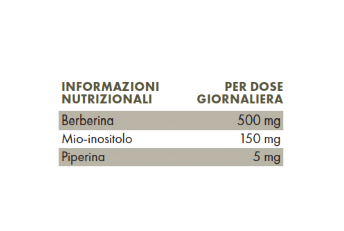 - Berberina Pura da Crespino: Estratta dalle radici di Berberis vulgaris, una sostanza vegetale (alcaloide) utilizzata da secoli per le sue proprietà nel supporto dei livelli di glucosio e colesterolo.