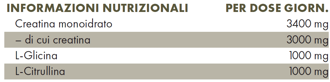 - Per la presenza di creatina il prodotto è destinato ai soli adulti. Non utilizzare in gravidanza.