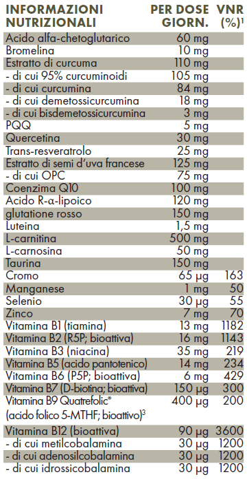 Altri ingredienti sono l’acido alfa-chetoglutarico, la bromelina, il coenzima Q10, l’estratto di semi d’uva francese, la luteina, il PQQ, la quercetina, il glutatione ridotto, il resveratrolo, l’acido R-α-lipoico e il Curcumin C3 Complex®. Questi ingredienti accuratamente selezionati completano perfettamente la composizione.