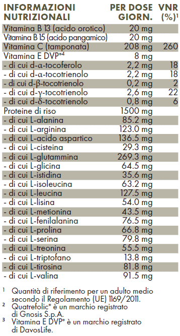 Proteine del riso, capsula: Idrossipropilmetilcellulosa (HPMC); L-carnitina, ascorbato di magnesio, L-glutatione, taurina, estratto di semi d’uva, acido R-alfa lipoico, estratto di curcuma (Curcumin C3 Complex®), coenzima Q10, L-arginina, L-carnosina, vitamina B3 (nicotinammide), zinco picolinato, albero della corda giapponese, estratto di nodini, vitamina E (DVP®), vitamina B2 (riboflavina-5-fosfato), acido pangamico, acido orotico, vitamina B5 (pantenato di calcio), vitamina B1 (tiamina HCl), bromelina, luteina, vitamina B6 (piridossal-5-fosfato), sale disodico di pirrolochinolina chinone, vitamina B9 (acido folico, Quatrefolic®, 5-metiltetraidrofolato), cromo picolinato, D-biotina, selenito di sodio, vitamina B12 (idrossicobalamina, adenosilcobalamina, metilcobalamina), manganese gluconato.