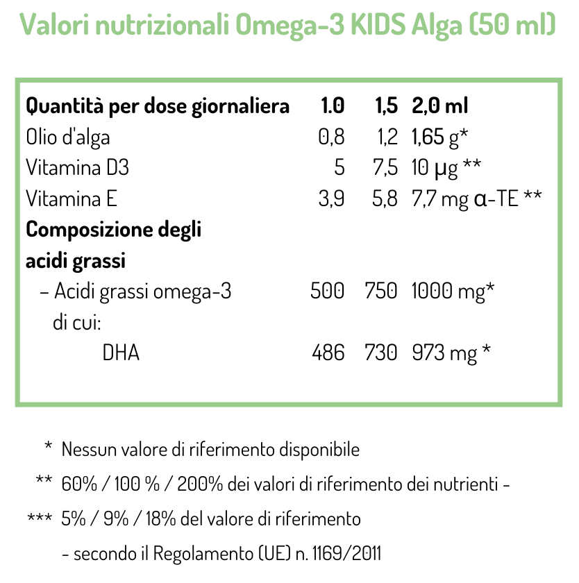 NORSAN Omega-3 per bambini KIDS Alga contiene un olio vegetale di alga ricco dell’acido grasso marino omega-3 DHA. È stato sviluppato appositamente per le esigenze dei bambini ed è facile da dosare grazie al cucchiaino dosatore in dotazione. La dose giornaliera raccomandata di 2 ml per un bambino di 35 kg contiene 1.000 mg di omega-3.