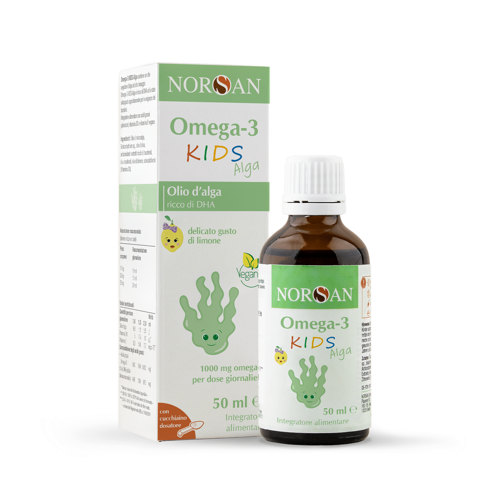 NORSAN Omega-3 per bambini KIDS Alga contiene un olio vegetale di alga ricco dell’acido grasso marino omega-3 DHA. È stato sviluppato appositamente per le esigenze dei bambini ed è facile da dosare grazie al cucchiaino dosatore in dotazione. La dose giornaliera raccomandata di 2 ml per un bambino di 35 kg contiene 1.000 mg di omega-3.