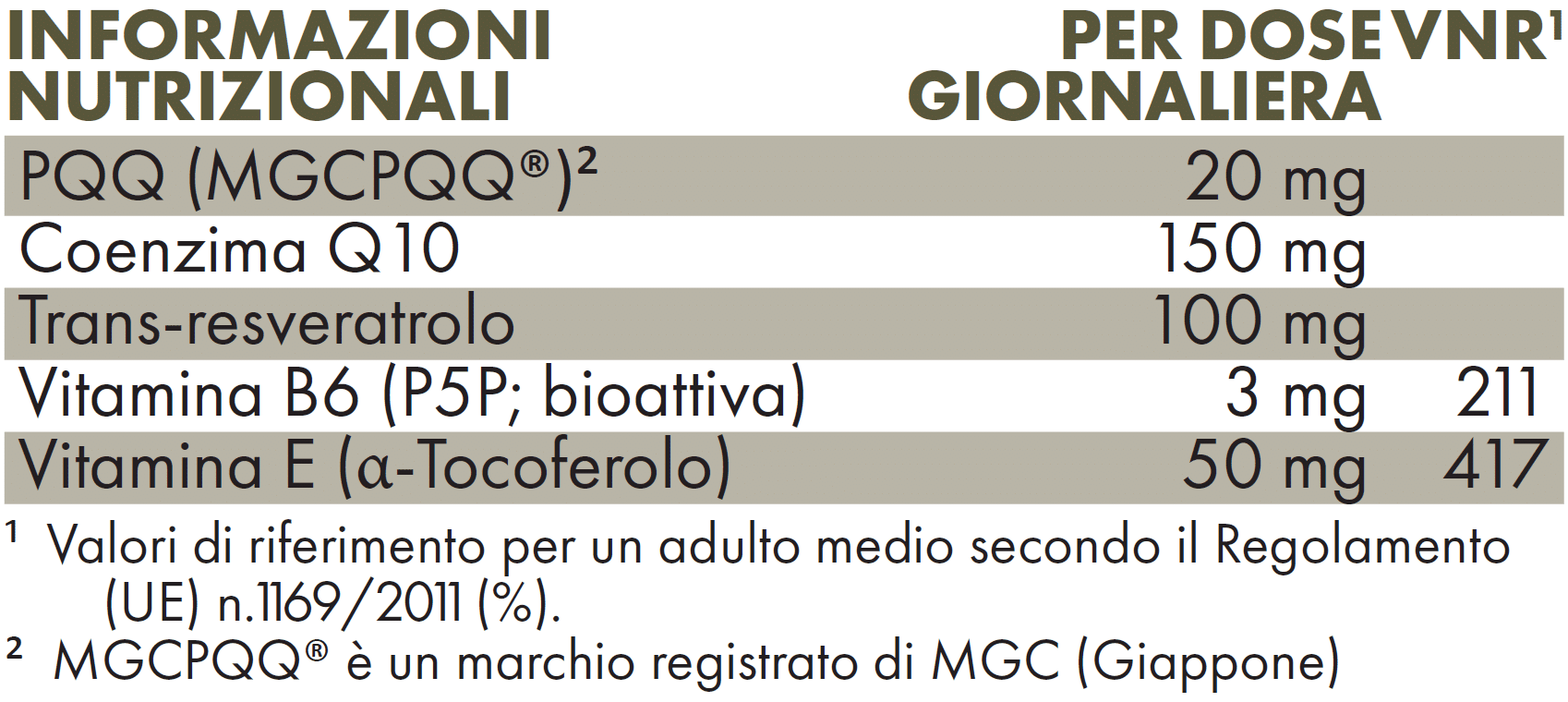 Coenzima Q10, agente di rivestimento delle capsule: idrossipropilmetilcellulosa, estratto di Reynoutria japonica (poligono del jappone), vitamina E (alpha-tocoferolo), sale di sodico di pirrolochinolina chinone, Vitamina B6 (piridossale-5-fosfato), transresveratrolo.