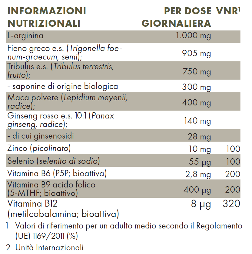 L-arginina, Fieno greco e.s. (Trigonella foenum-graecum, semi);Tribulus e.s. (Tribulus terrestris,frutto); saponine di origine biologica, Maca polvere (Lepidium meyenii,radice); Ginseng rosso e.s. 10:1 (Panax ginseng, radice); Zinco (picolinato) ,Selenio (selenito di sodio), Vitamina B6 (P5P; bioattiva), Vitamina B9 acido folico (5-MTHF; bioattivo) , Vitamina B12(metilcobalamina; bioattiva), involucro della capsula: idrossipropilmetilcellulosa (HPMC);
