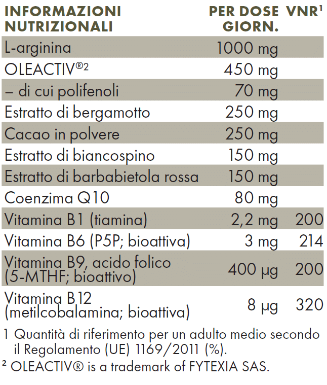 L-arginina, agente di rivestimento: idrossipropilmetilcellulosa (HPMC); OLEACTIV®, estratto di bergamotto, cacao biologico (11 %),